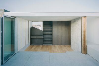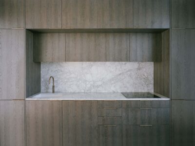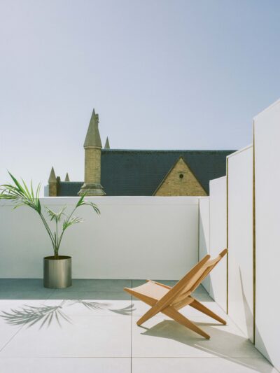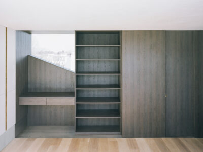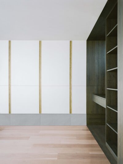 A contemporary thin white ‘band’ is placed atop, floating horizontally across the roof terrace and continuing the ‘parallel’ theme set by the host building. Taking inspiration from Ludwig Mies van der Rohe’s legendary Barcelona Pavilion, we selected opulent materials such as patinated brass, used primarily in a cruciform feature column, Bianco Eclipsia Quartz and darkened oak to delineate internal space. A glazed façade of bi-fold doors and recessed glass help to further dissolve the threshold connected with the newly tiled roof terrace.