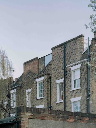 The historical context and robust façade articulation were the starting points. Horizontal stucco banding and cornicing features form parallel lines along the dominant front elevation of the terraced houses, culminating at the second-floor parapet to the roof terrace.