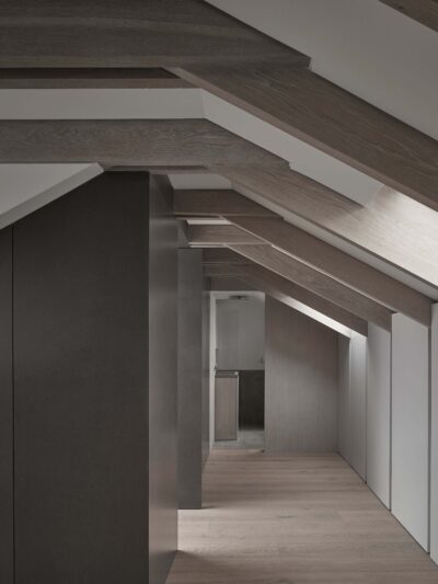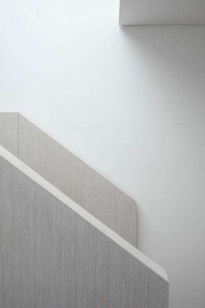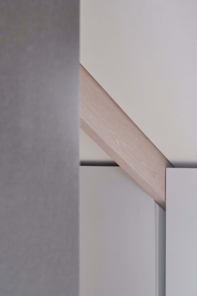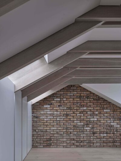 Within this space a white-washed oak staircase gently touches the existing half landing, celebrating the threshold between traditional and contemporary. Entry into the new master suite is through a Valchromat-lined threshold further accentuating the shift from old to new. Here, the roof structure is revealed as white-washed oak beams running across the space, culminating in double oak beams linking the large window to the outside.